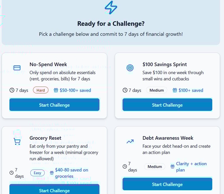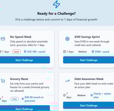 Challenges & Rewards system is designed to help you build better money habits without guilt, pressure, or unrealistic rules.